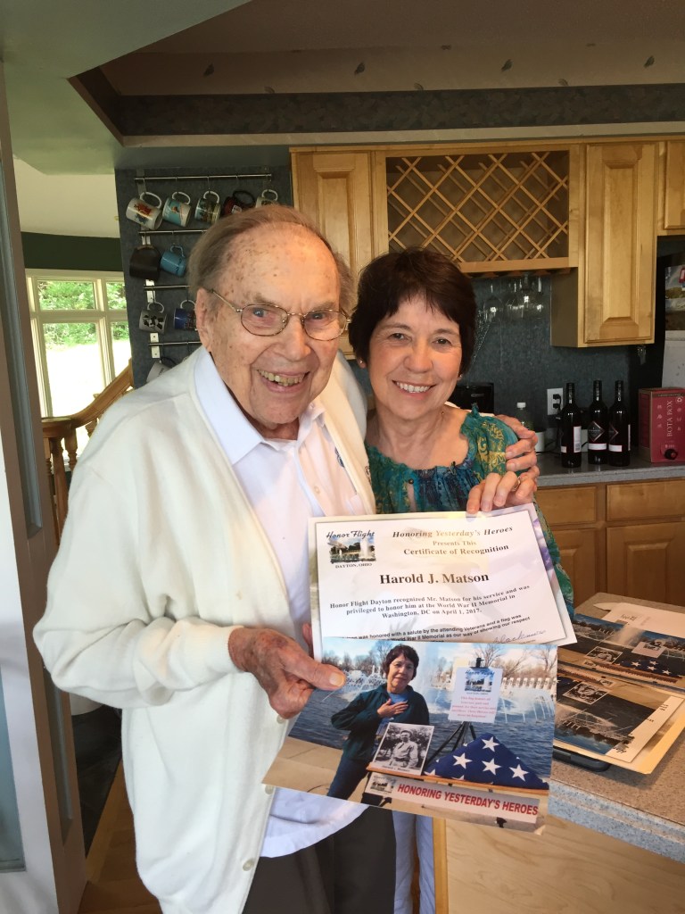Although Harold J. Matson was never able visit the World War II Memorial in Washington, D.C., a friend Janie Jordan represented him as part of an Honor Flight in 2017. She returned with an official Certificate of Recognition given to those unable to travel to see the site in person. Harold passed away on December 17, 2020 at the age of 96, but he would be pleased to know that others have read and shared his story.